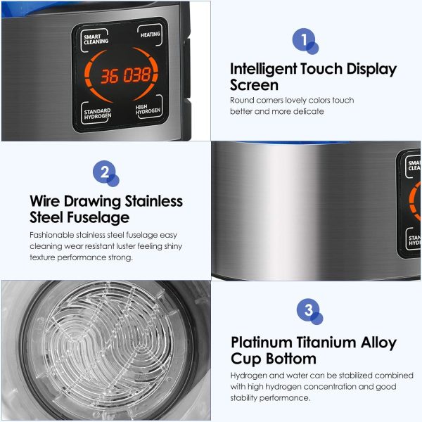 • Beneficial for Your Health: Drinking hydrogen rich water regularly is beneficial for your body and boosts your immune system. The active hydrogen in alkaline hydrogen water combines with radicals, penetrates deeply, activates body cells, improves the digestive system, and effectively enhances metabolism. Intelligent cleaning function: Press the intelligent cleaning button, the blue green light flashes, and the machine will automatically shut down after intelligent cleaning is complete.