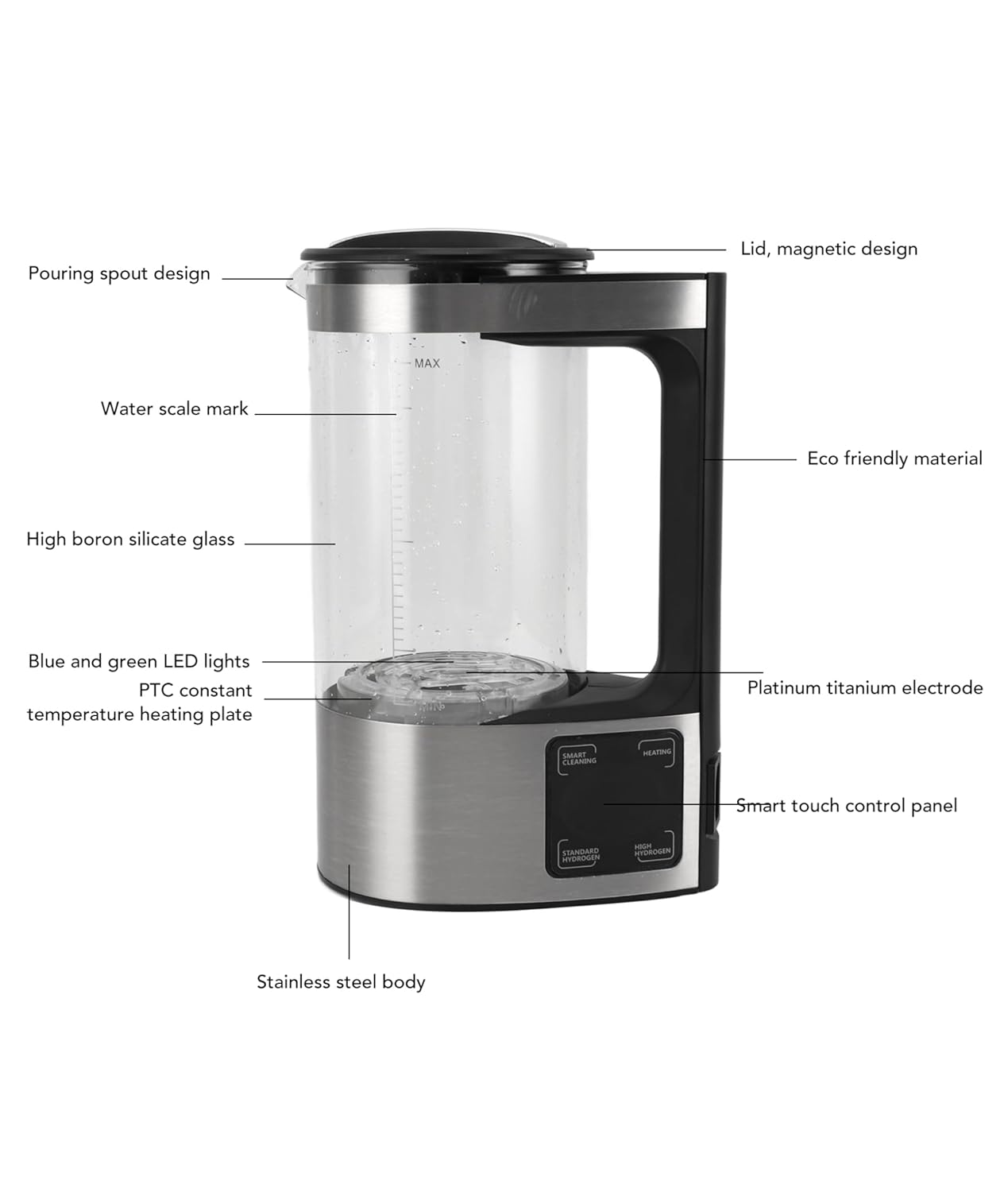 • Safe Material: The hydrogen water machine is made with premium high borosilicate glass, which is transparent, safe, and healthy. It features a professional digital touch control LED display screen that is sensitive to touch. The platinum material has a long service life, high hydrogen concentration, and no worries about ozone. Drinking hydrogen water can reduce blood lipids, improve sleep quality, and purify the blood. The 2L capacity fulfills the needs of the whole family.